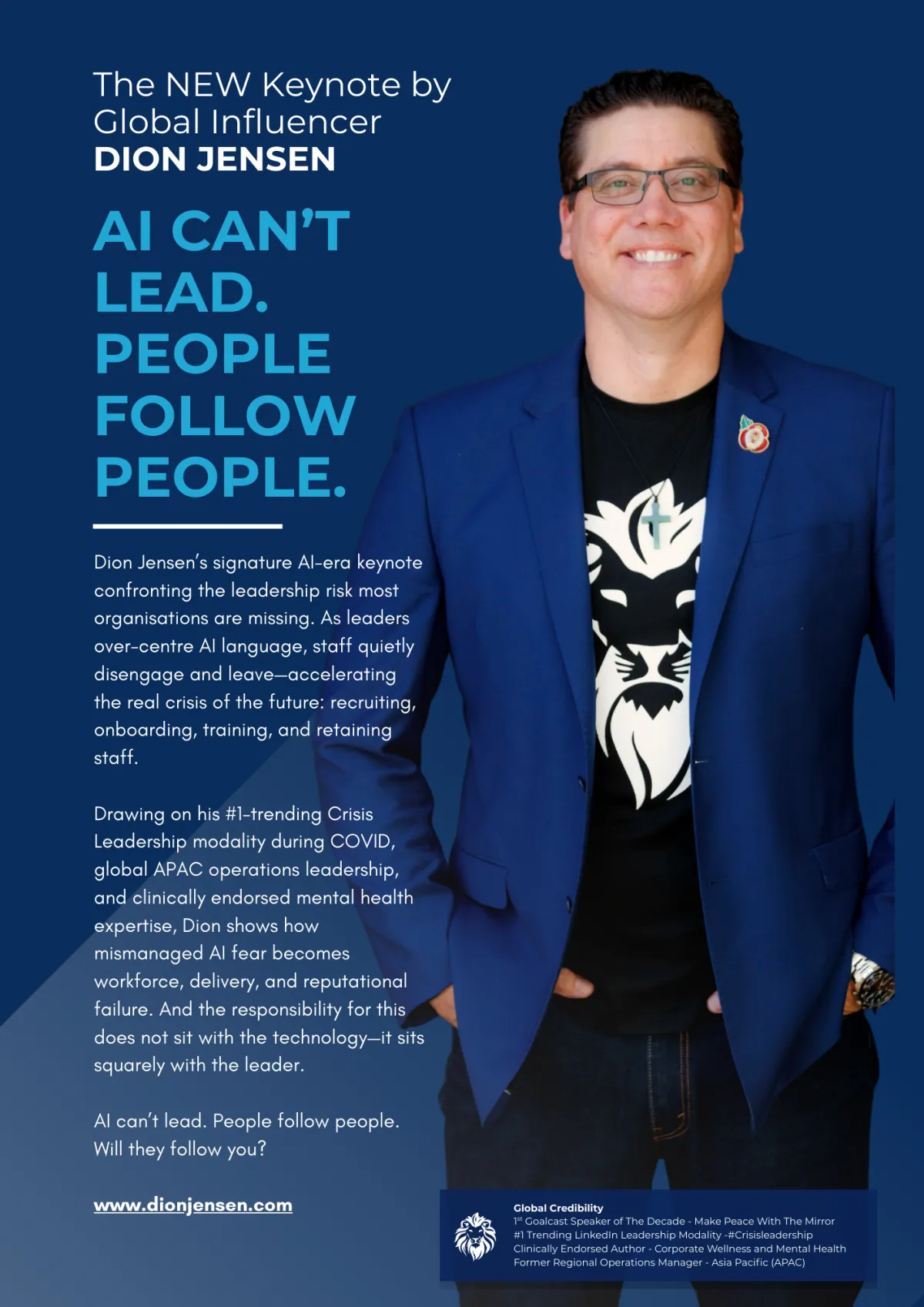 Dion Jensen’s signature AI-era keynote names the leadership risk others miss: every time organisations over-centre AI language, they quietly devalue their people—fueling disengagement and accelerating the real crisis of the future: recruiting, onboarding, training, and retaining staff.