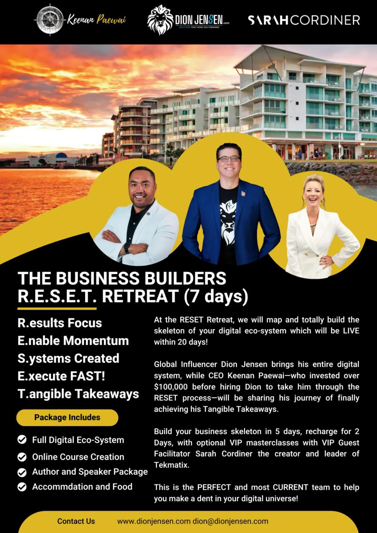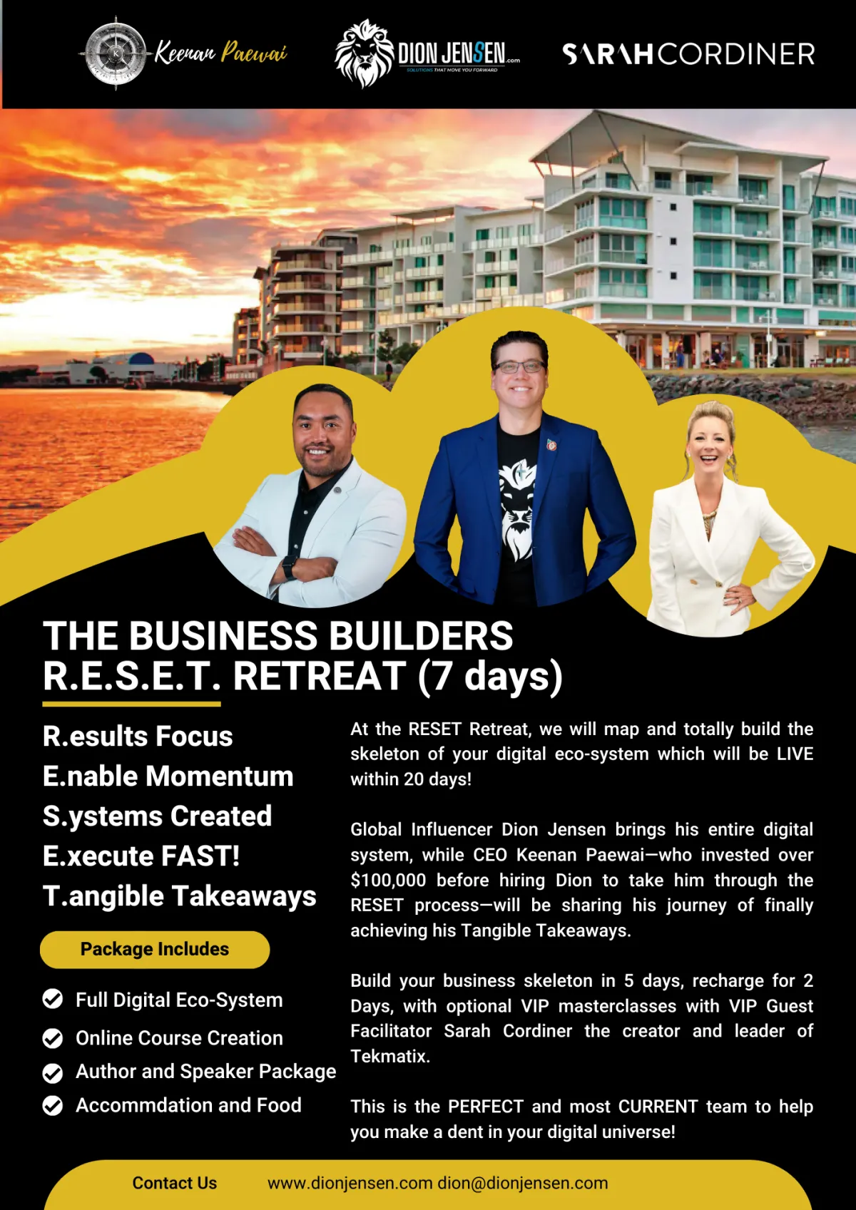 The Business Builders 7-Day RESET Retreat was created through a powerful collaboration between Dion Jensen, Keenan Paewai, and Sarah Cordiner — three leaders who combine global experience, proven systems, and world-class technology.